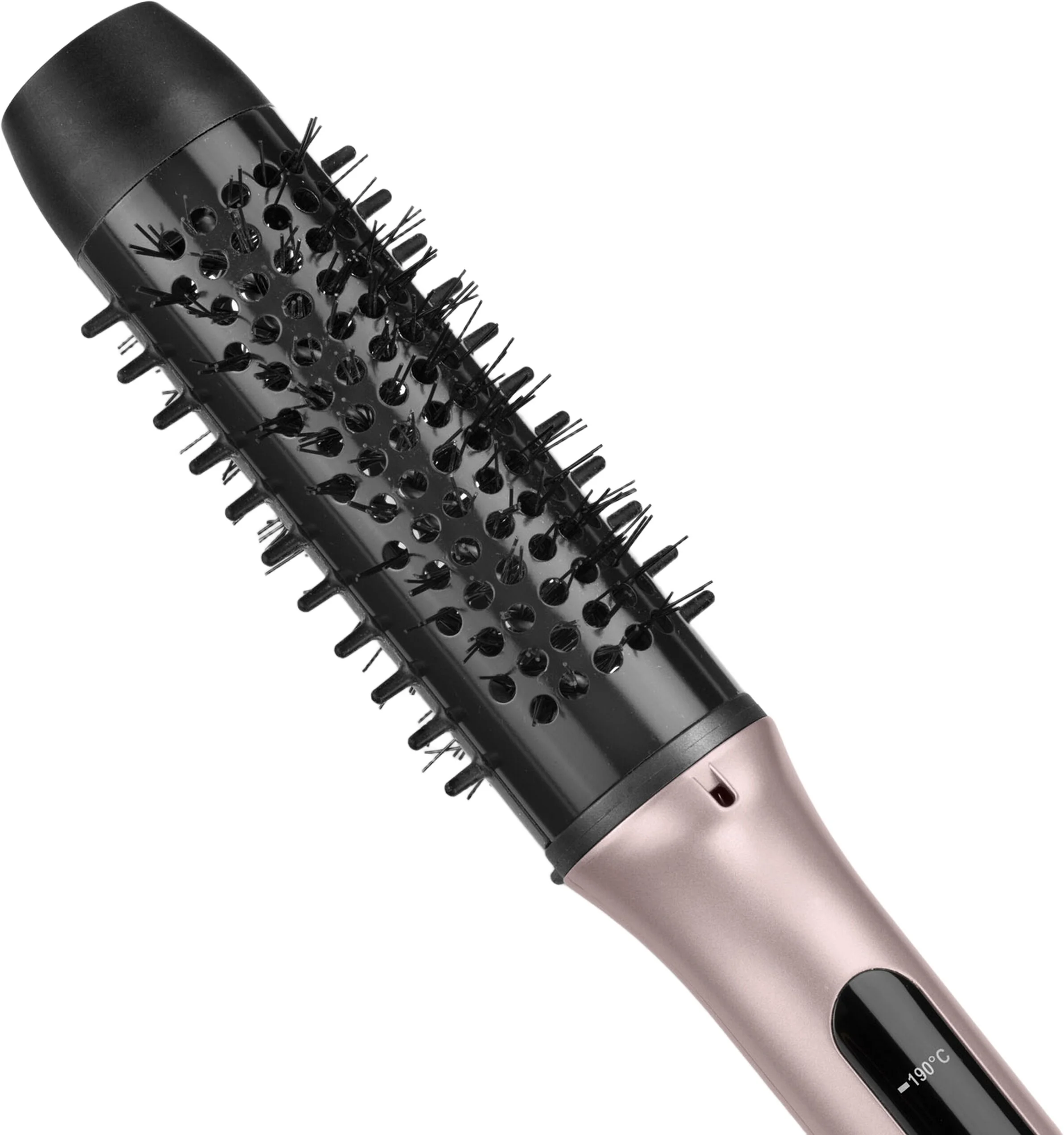 Podgrzewana, okrągła szczotka ceramiczna o średnicy 38 mm unosi włosy u nasady i nadaje im sprężystego kształtu. W kilka chwil stworzysz pełną objętości fryzurę z efektem jak po wizycie w salonie.